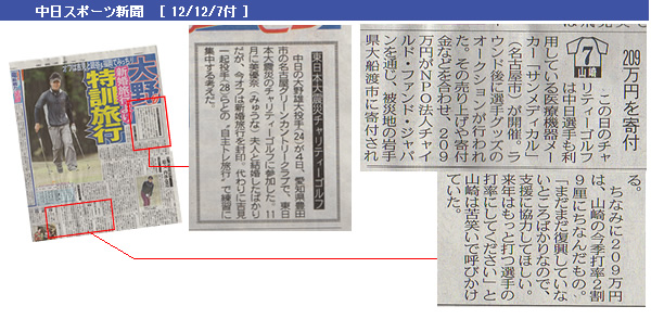 この大会を通して、NPO法人チャイルド・ファンド・ジャパン様へ東日本大震災復興支援金として209万円を寄付させていただきました。この「209万円」は、山﨑選手の今季打率にちなんだもの。翌日の中日スポーツにも掲載されていましたが、山﨑選手からは「まだまだ復興していないところばかりなので支援に協力してほしい」と呼びかけられ、「来年はもっと打つ選手の打率にしてください」と、会場内を沸かせていました。